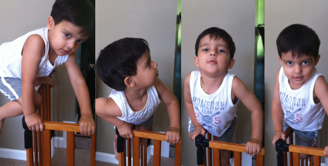 With Mehar, simply telling her that fireplace was hot and dangerous with elaborate scared facial expressions worked. Kabir just gave us a smirk. We thought the wooden gate would help. He defeated us soon. He grabbed his toy doctor box, put it upside-down, climbed on it, and voila, he was swinging over the security gate. I had to hide the box. He was all of 23 months then.